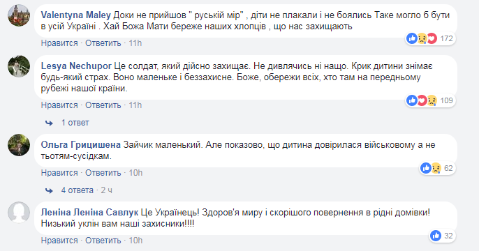"Низкий поклон вам, наши защитники!" "Это солдат, который действительно защищает", "Пока не пришел "русский мир" дети не плакали и не боялись", "Крик ребенка о помощи - единственное, что заставляет быть не бесчувственным", "Боже, как жаль деток! Будьте прокляты те, кто развязал эту войну", - пишут комментаторы.