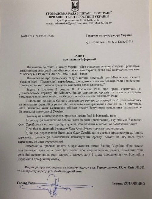 Громадська Ради з питань люстрації при Міністерстві юстиції України 26 січня 2018 року звернулась із запитом про надання інформації до Генеральної прокуратури щодо Валендюка Олега Сергійовича, який ще торік у листопаді обіймав посаду заступника начальника управління ГПУ.