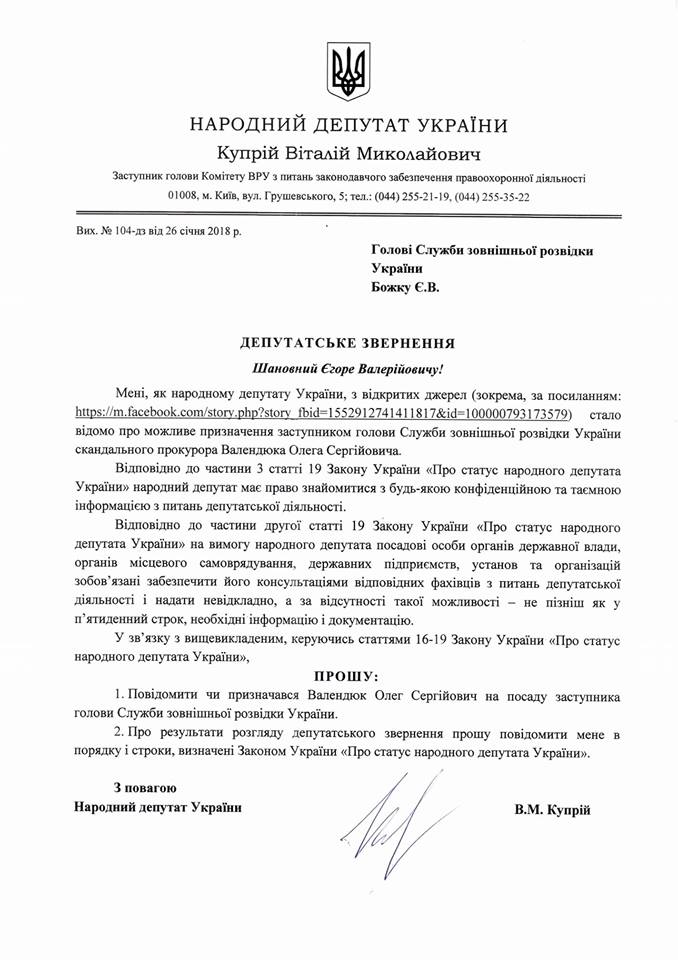 Із відповідним зверненням із цього приводу до голови СЗРУ звернувся і народний депутат України Віталій Купрій.