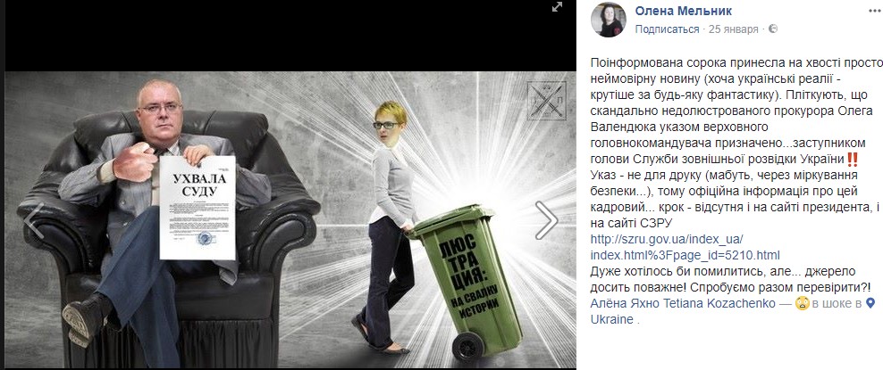 Напередодні, 25 січня 2018 року редактор Резонансу Олена Мельник оприлюднила у мережі Facebook неофіційну інформацію про призначення ”скандально недолюстрованого прокурора Олега Валендюка” заступником голови Служби зовнішньої розвідки України.