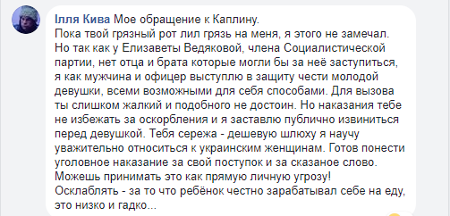 «Поки твій брудний рот лив бруд на мене, я цього не помічав. Але так як у Єлизавети Ведякової, члена Соціалістичної партії, немає батька і брата, які могли б за неї заступитися, я як чоловік і офіцер виступлю на захист честі молодої дівчини усіма можливими для себе способами. Для виклику ти занадто жалюгідний і подібного не гідний. Але покарання тобі не уникнути за образи, і я змушу публічно вибачитися перед дівчиною. Тебе Сергію – дешеву повію – я навчу шанобливо ставитися до українських жінок. Готовий понести кримінальне покарання за свій вчинок і за сказане слово. Можеш приймати це як пряму особисту погрозу! Ображати за те, що дитина чесно заробляла собі на їжу – це низько і гидко», – написав він у зверненні до депутата.