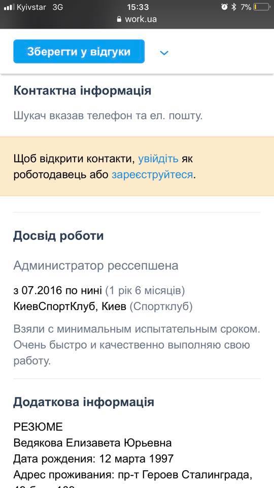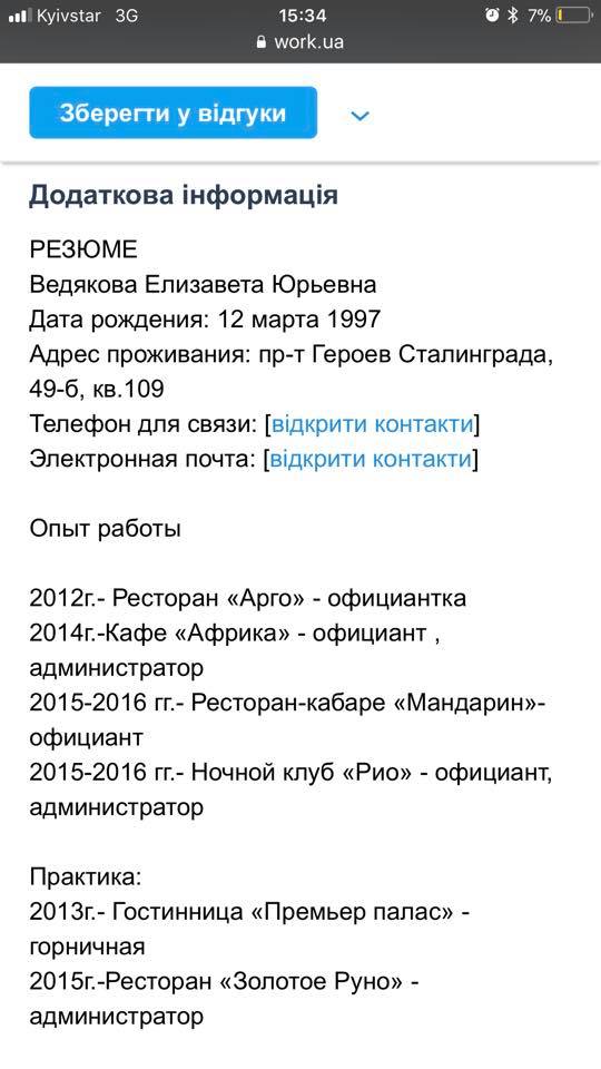 На підтвердження своїх слів депутат опублікував скріншоти з резюме дівчини, у якому вказано, що у 2015-16 рр. Ведякова працювала офіціантом і адміністратором у нічному клубі «Rio»