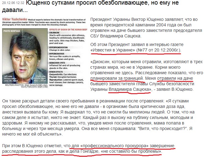 Следственная группа, которая расследовала отравление Виктора Андреевича (на тот момент кандидата в Президенты), рассматривала все версии – начиная от абсурдных, которые обожают сторонники ПР: никакого отравления не было или же Ющенко согласился принять диоксин, чтобы вызвать сочувствие у избирателей и уже наверняка выиграть президентские выборы.