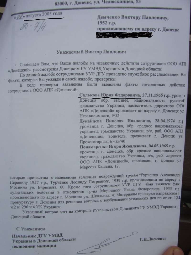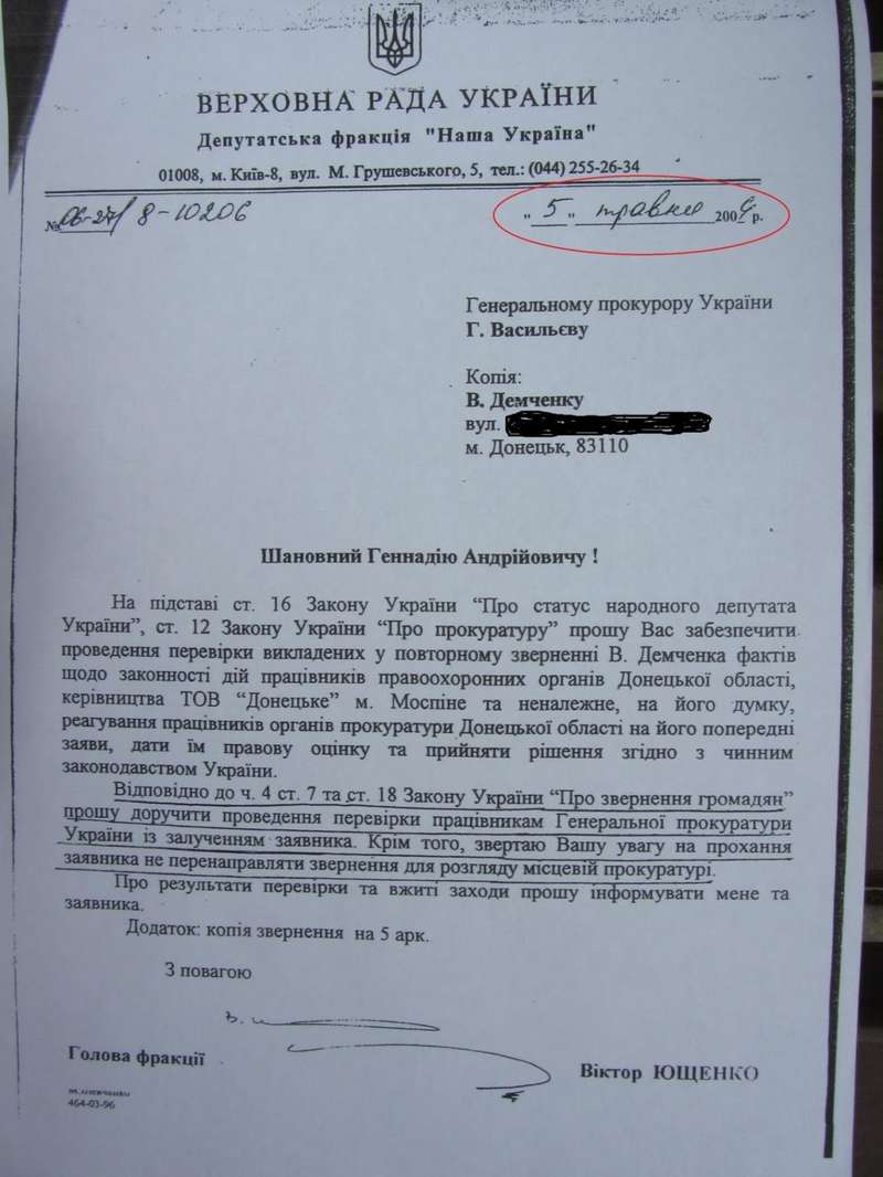 На фото – реакция Ющенко на обращение жителя Моспино о беспределе банды Немсадзе.
