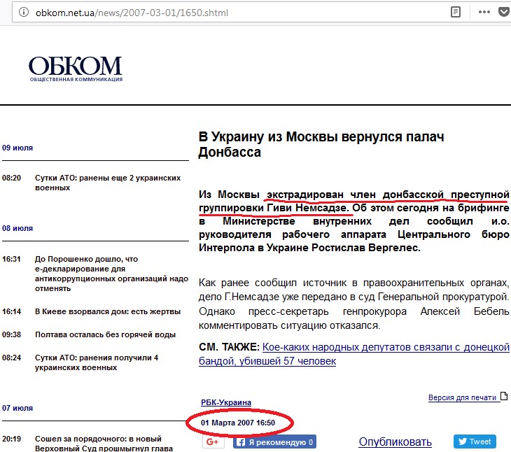 Здесь в полной мере проявилась «искренность» Витальевича, ведь он еще в конце мая 2007го (в тот непродолжительный период, когда не был министром) пиарился на этой теме. В интервью «Зеркалу недели» заявил, что видел «находящегося в международном розыске Гиви Немсадзе» свободно разгуливающим по центру Киева!