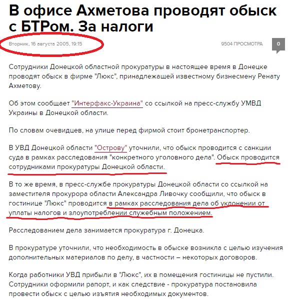 Тем не менее, 16 августа 2005го донецкие правоохранители, которые поверили в честность намерений Луценко, провели обыск в резиденции «Люкс» уже по другому поводу. Причем, использовали БТР, потому что охрана не хотела пускать непрошеных гостей в отсутствии хозяина. Здесь основанием выступило подозрение в неуплате налогов, но во время обыска нашли другие вещдоки, которые позволили связать Ахметова и Немсадзе.
