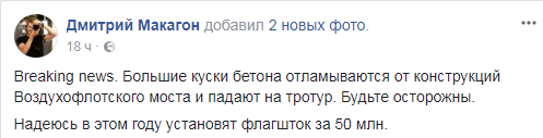 "Большие куски бетона отламываются от конструкций Воздухофлотского моста и падают на тротуар. Будьте осторожны", — написал он.