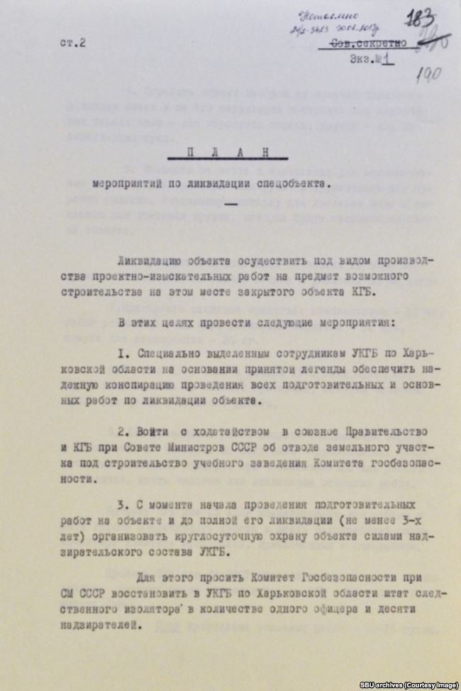 Первый документ с грифом "совершенно секретно" датирован 5 июня 1969 года. Это письмо начальника УКГБ по Харьковской области генерал-майора П. Фещенко главе КГБ Украины В. Никитченко – о том, как были найдены могилы и опрошены бывшие сотрудники НКВД. Завершается письмо так: "Нарушенная могила нами восстановлена и образовавшиеся провалы земли будут засыпаны. По мере выявления "слухов" о характере могил нами буду приниматься меры дезинформации".
