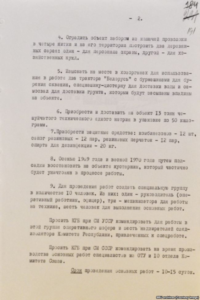 Последний документ 1969 года, обнародованный Константином Тимофеевым, – письмо генерала Фещенко генералу Никитченко от 19 июня. Начальник Харьковского УКГБ отчитывается о своей поездке в Москву и встрече с Андроповым и его заместителем Цвигуном. Его план был полностью принят: могилу решено уничтожать с помощью химикатов – чешуйчатого технического едкого натрия, оградив забором из колючей проволоки, и возвести два строения – для охраны и хранения химикатов. Ликвидировать захоронение будет 21 человек, для их нужд выделено 10 000 рублей, самосвал, грузовая машина с буроустановкой, автоцистерна и легковая машина ГАЗ-69.
