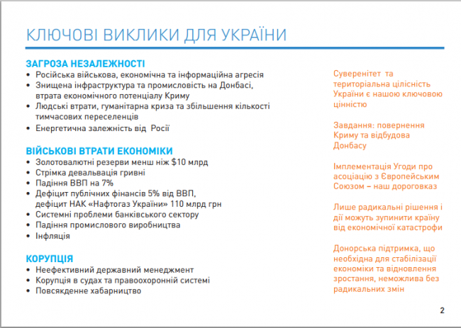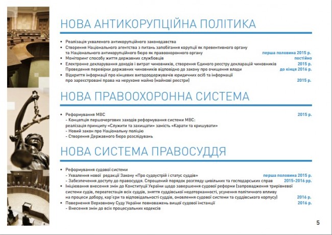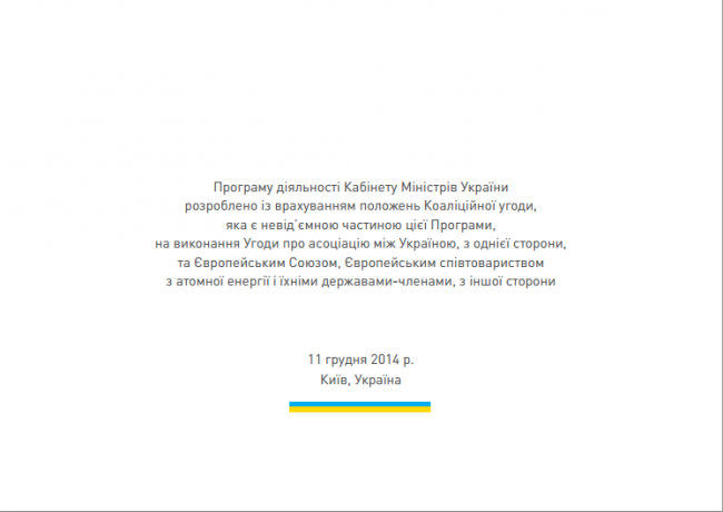 Можно утверждать, что нынешняя программа правительства – правовой акт, созданный с одной-единственной целью: предоставить Кабинету министров политические и правовые гарантии того, что парламент позволит ему беспрепятственно работать как минимум в течение следующего года. Верховная Рада приняла этот документ, правительство Яценюка фактически получило годовой иммунитет от отставки. Таким образом, эта цель программы была выполнена.