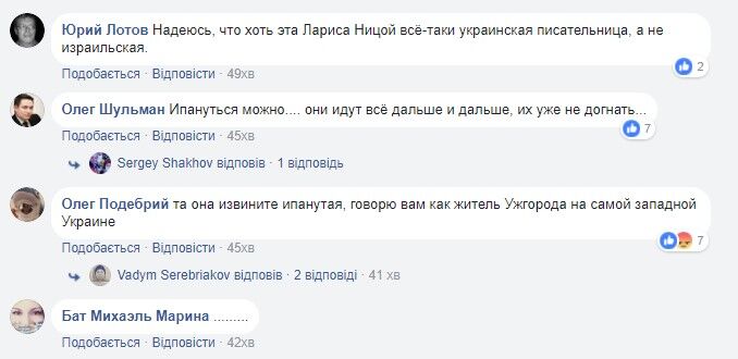 Заявление детской писательницы вызвало живую дискуссию под постом Долинского. Нашлись те, кто раскритиковал Ницой и ужаснулся, что ее книги читают украинские дети. Другие уличили ее в антисемитизме и назвали ее "юдофобкой".