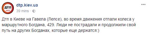 "ДТП в Киеве на Гавела (Лепсе), во время движения отпали колеса у маршрутного Богдана, 429. Люди не пострадали и продолжили свой путь на других Богданах, которые еще держатся", - говорится в сообщении.