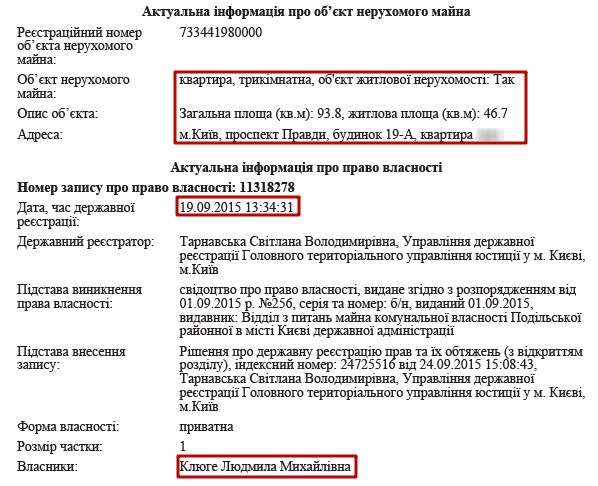 Згідно реєстру майнових прав з 2015 року у власності дружини прокурора перебуває житло площею 93 кв. м. за адресою проспект Правди, 19-А. Втім, вартість цієї квартири Людмила Михайлівна не запам’ятала. Цікаво, що у декларації Людмили Михайлівни зазначено, що її діти та чоловік отримали право на користування цією квартирою ще у 2008 році. Це підтверджує і її декларація за 2013 рік, де вказано, що вона є власником квартири площею 93,8 кв. м. (тільки в декларації вказана площа 92,8 кв. м., що більше схоже на помилку). От тільки цієї квартири немає у декларації прокурора Олександра Геннадійовича за аналогічний 2013 рік.