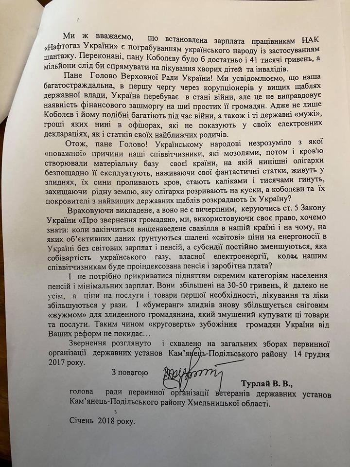 «Аналізуючи цю конституційну норму і рівень грошового утримання керівництва НАК «Нафтогаз України», ми, ветерани праці, прийшли до висновку, що природні ресурси належать не українському народу, а керівництву самого «Нафтогазу». Органи державної влади розщедрилися за рахунок цього ж народу, власника надр, оплачувати роботу найманих працівників «Нафтогазу» щомісячними мільйонними ставками, в той час як народ-власник ледь виживає», – йдеться в документі.