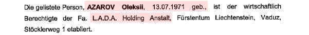 В распоряжении автора оказалось письмо Министерства внутренних дел Австрии в земельный суд Мария-Целль о том, что активы лихтенштейнской фирмы L.A.D.A. Holding контролируются сыном сбежавшего премьер-министра Украины. L.A.D.A. Holding напрямую на 100% принадлежат Алексею Азарову. Министерство требовало заморозить эти активы согласно решению о введении санкций Евросоюза против Азарова-младшего.