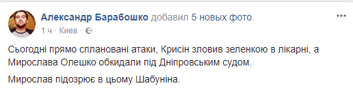 По его словам, Олешко почему-то подозревает в нападении главу «Центра противодействия коррупции» Виталия Шабунина.