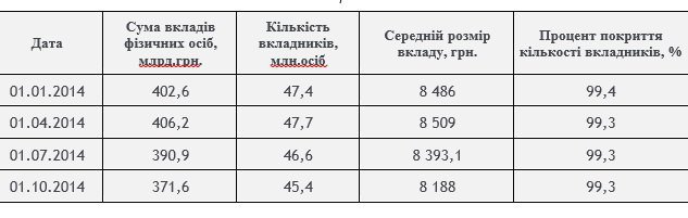 Але фінансові реалії сьогодення ставлять перед Фондом абсолютно інші виклики, адже вкладники почали панічно забирати свої кошти з банків. За період з січня по жовтень 2014 року загальний відтік депозитів фізичних осіб становив 47,9 млрд грн та $ 8,2 млрд, а сума вкладів фізичних осіб, що гарантовані Фондом, скоротилася на 31 млрд грн. Кількість учасників Фонду, що є обов’язковою умовою для отримання банківської ліцензії, в період із 01.01.2014 по 01.12.2014 зменшилася на 12 – зі 178 до 165.