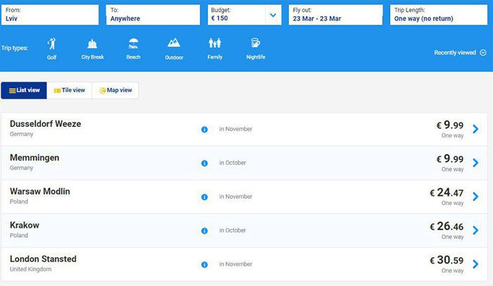 Ирландский лоукостер запустил продажу билетов в Украине. Цены начинаются от €10. Средняя цена билетов будет ниже €40. Вылеты начнутся с октября 2018 года.