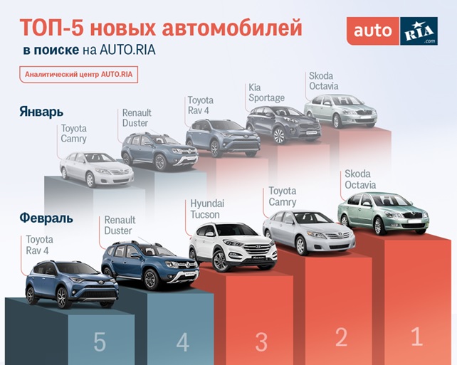 Что же касается новых автомобилей, то тут интересы украинцев меняются более радикально. При незыблемых позициях лидера Skoda Octavia, обладатель январского второго места Kia Sportage не попал даже в пятерку.