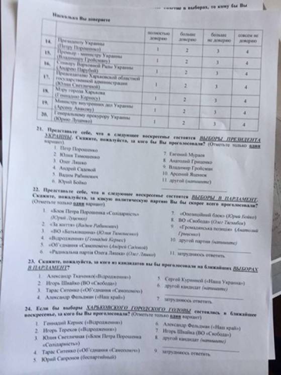 У кабінеті голови Новобаварської РДА Харкова Тетяни Цибульник, де сьогодні правоохоронці проводять обшуки, були знайдені анкети для проведення соцопитування на користь Геннадія Кернеса.