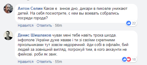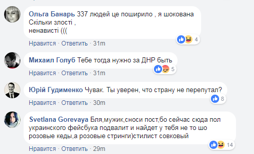 "Нашел, чем гордиться!" "Чувак, ты уверен, что страну не перепутал?" "Тебе тогда нужно за "ДНР" быть", "Стилист совковый", "Я в шоке, сколько злости, ненависти", "Нормальные пацаны", "Какое е*анное дно, дикари в пикселе унижают детей. На себя посмотрите, с кем вы воевать собрались посреди города?" "Чувак, мне тебя даже немного жаль. Иди себе в офлайн, бей людей за внешний вид, делай, как привык", - пишут комментаторы.