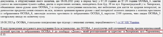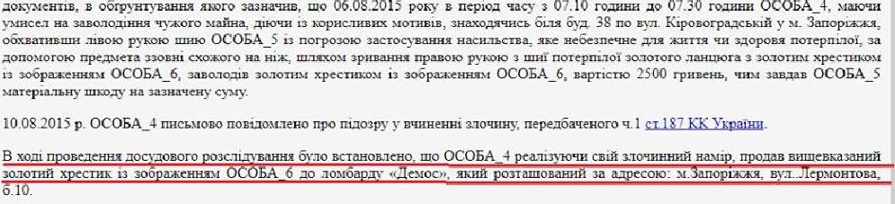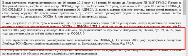 Или вот: «…повідомив, що після крадіжки золотих прикрас, він 13 жовтня 2015 року знаходячись у ломбарді ЮК «Демос», що розташований за адресою: м. Запоріжжя, пр. Леніна, буд. 89, кв. 29, збув туди два золотих кільця, які він раніше викрав у гр. ОСОБА_3».