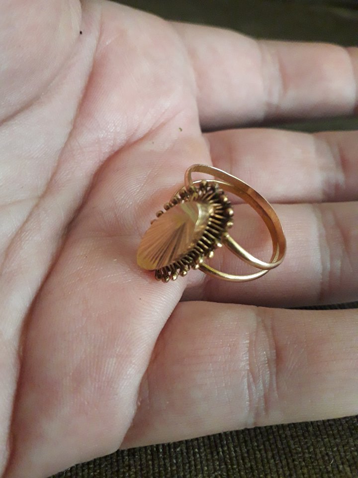 «Кольцо в форме двойного ободка, а печатка в форме овала с лепестками, его ни с чем не спутаешь. Украли только вчера, вам не сдавали случайно?!»