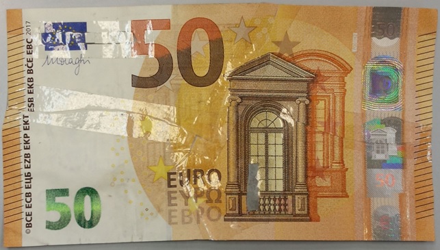 К нацбанковской телеграмме прилагаются фото поврежденных банкнот 50 евро, которые выявлены в Ивано-Франковском филиале Приватбанка во время инкассации терминалов.