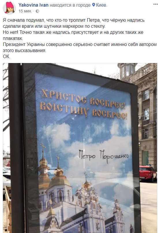 "Я сначала подумал, что кто-то троллит Петра, что чёрную надпись сделали враги или шутники маркером по стеклу. Но нет! Точно такая же надпись присутствует и на других таких же плакатах. Президент Украины совершенно серьезно считает именно себя автором этого высказывания", - пишет журналист Иван Яковина.