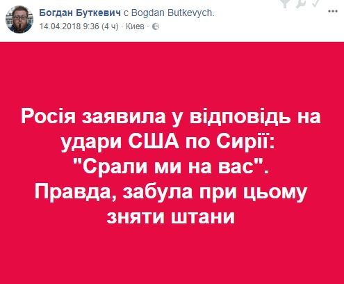 В частности, пользователи делились своими мнениями о ситуации в Twitter и Facebook. "Минобороны России заявило, что ни одна из выпущенных США, Великобританией и Францией ракет не входила в зону ответственности подразделений российских ПВО в Сирии. А я все думал, как они прокомментируют свою ничтожность!" – пишет фейковый аккаунт Дональда Трампа.