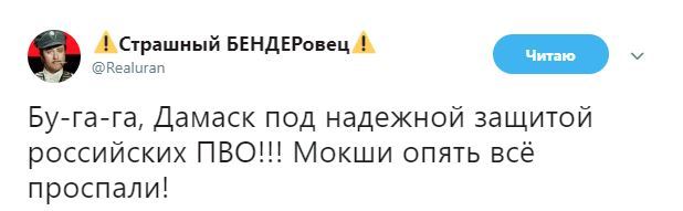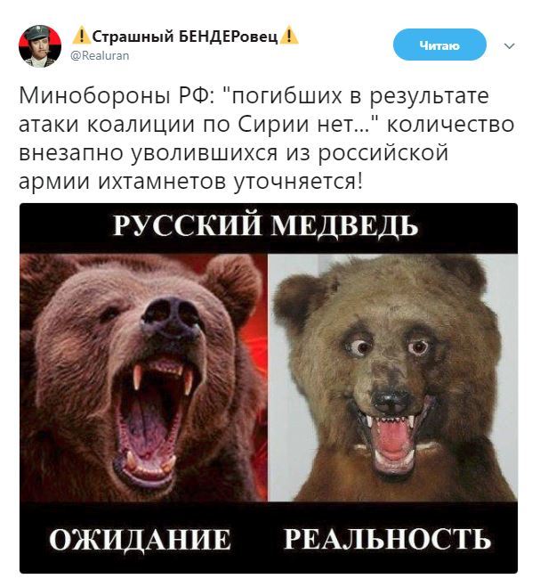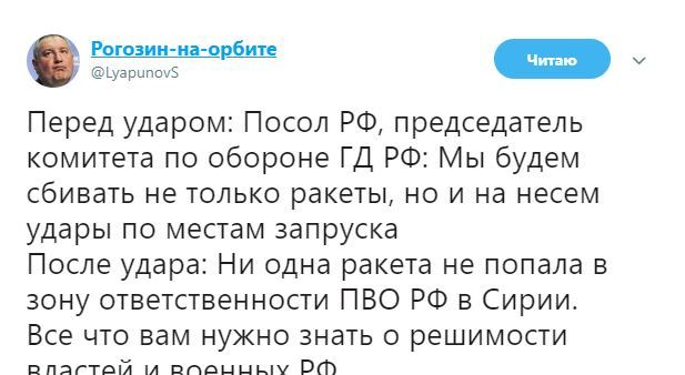 ‏"Перед ударом: Посол РФ, председатель комитета по обороне ГД РФ: Мы будем сбивать не только ракеты, но и на несем удары по местам запуска. После удара: Ни одна ракета не попала в зону ответственности ПВО РФ в Сирии. Все что вам нужно знать о решимости властей и военных РФ", – пишет блогер Рогозин-на-орбите.