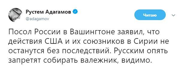 "Посол России в Вашингтоне заявил, что действия США и их союзников в Сирии не останутся без последствий. Русским опять запретят собирать валежник, видимо", – резюмировал Рустем Адагамов.