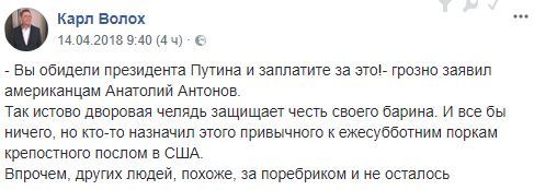"Вы обидели президента Путина и заплатите за это!" – грозно заявил американцам Анатолий Антонов. Так истово дворовая челядь защищает честь своего барина. И все бы ничего, но кто-то назначил этого привычного к ежесубботним поркам крепостного послом в США. Впрочем, других людей, похоже, за поребриком и не осталось", – отметил Карл Волох.