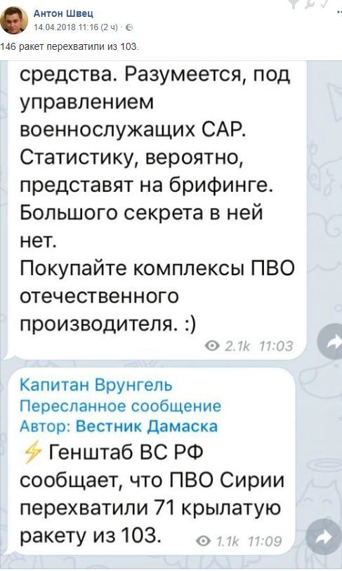 "146 ракет перехватили из 103", – иронизирует Антон Швец.