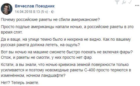 "Почему российские ракеты не сбили американские? Просто подлые американцы напали ночью, а российские ракеты в это время спят. Да и вообще, на улице темно было и ни***на не видно. Как по-вашему русская ракета должна лететь, на ощупь?" – заявил Вячеслав Поездник.