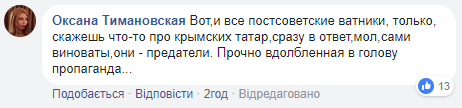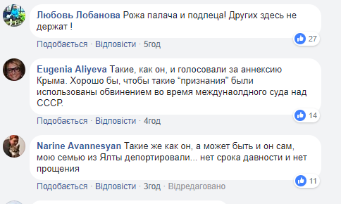 "И ни тени сомнения, не говоря уже о раскаянии", "Все постсоветские в**ники, только, скажешь что-то про крымских татар, сразу в ответ, мол, сами виноваты, они - предатели. Прочно вдолбленная в голову пропаганда...", "Такие, как он, и голосовали за аннексию Крыма", "Лицо, не обезображенное интеллектом", - прокомментировали пользователи.
