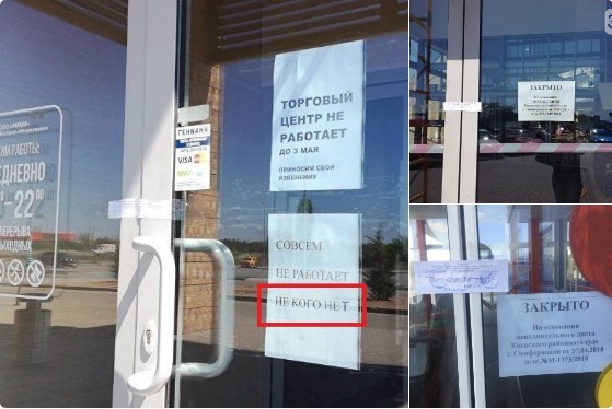 5. Оккупанты продолжают закрывать огромное количество торговых центров по всему Крыму, на дверях которых с ошибками сообщают, что “НЕ КОГО нет” и “приносят извЕнения”