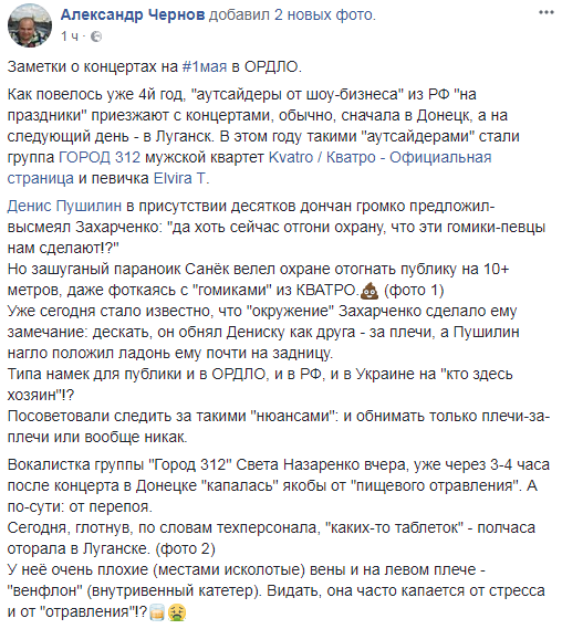 "Вчера, уже через 3-4 часа после концерта в Донецке "капалась" якобы от "пищевого отравления". А по-сути: от перепоя. Сегодня, глотнув, по словам техперсонала, "каких-то таблеток" - полчаса оторала в Луганске. У неё очень плохие (местами исколотые) вены и на левом плече - "венфлон" (внутривенный катетер). Видать, она часто капается от стресса и от "отравления", - подчеркнул Чернов.