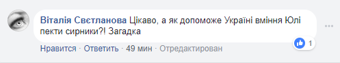 А вот Виталия Светланова не может понять, как кулинарные способности помогают политику заниматься государственными делами. "Интересно, а как поможет Украине умение Юлии печь сырники?" - написала она в фейсбуке.