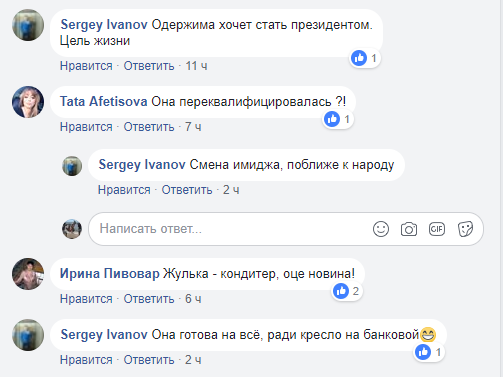 Некоторые пользователи Сети уверены, что Тимошенко сделала данную публикацию с целью смены имиджа накануне президентских выборов в Украине. "Юля - кондитер? Вот это новость", "Смена имиджа, поближе к народу", "Она готова на все, ради кресла на Банковой", "Ожержимая, хочет стать президентом", - такие комментарии пестрят в соцсети.