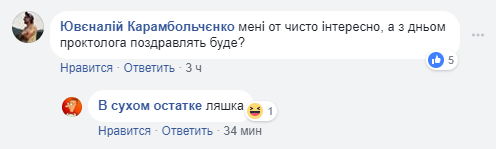 Интересуется возможной медицинской практикой Юлии Владимировны и Ювеналий Карамбольченко. "Мне вот интересно, с Днем проктолога поздравлять будет?" - спрашивает он.