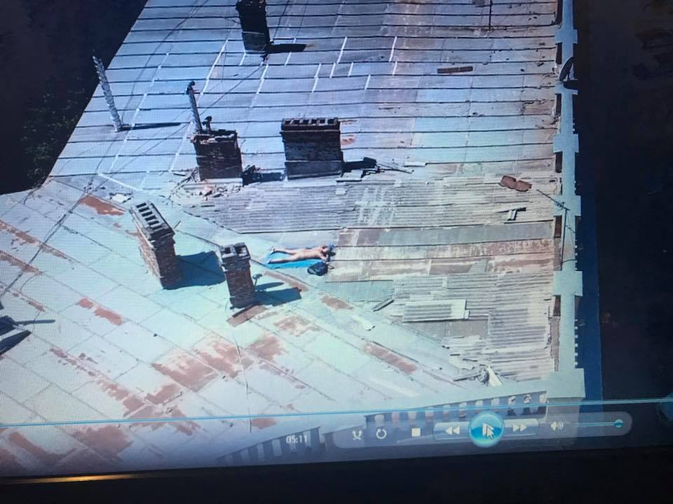 "Просматриваю видео, а тут чувак на крыше загорает", - написала она на своей странице в Facebook и опубликовала фото.