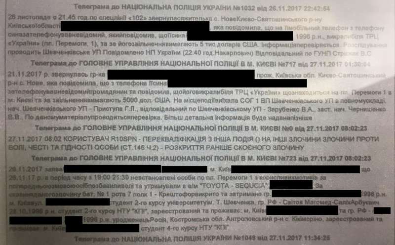 Происшествие случилось еще 26 ноября (в одной из телеграмм указано 21 число, но это, скорее всего ошибка – прим. авт.) 2017 года. В 21:45 женщина обратилась по линии «102» о том, что на ее телефон перезвонили с номера сына и сообщили, что его похитили возле ТРЦ «Украина» (площадь Победы, 1) в Киеве. За его освобождение киднепперы потребовали 5000 долларов.