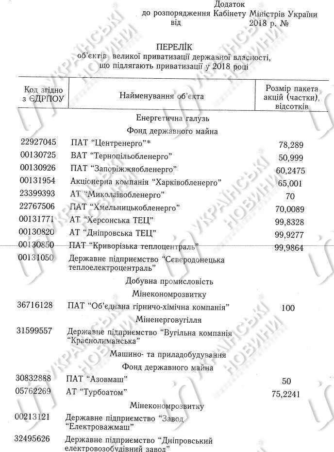 Согласно распоряжению, 18 объектов, которые находятся в управлении ФГИ будут выставлены на продажу: энергопоставляющие компании "Тернопольоблэнерго", "Запорожьеоблэнерго", "Харьковоблэнерго", "Николаевоблэнерго", "Хмельницкоблэнерго", теплоэлектроцентрали (ТЭЦ) - Херсонская ТЭЦ, Днепровская ТЭЦ, Криворожская ТЭЦ, Северодонецкая ТЭЦ, "Азовмаш", "Турбоатом", Запорожский титано-магниевый комбинат, "Ориана", Завод алюминиевой фольги, "Президент-Отель", "Центрэнерго", Одесский припортовый завод и "Сумыхимпром".