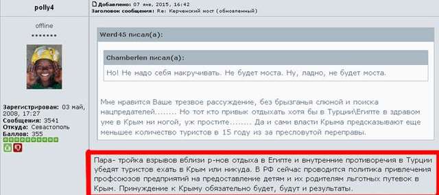 „Пара-трійка вибухів поблизу районів відпочинку в Єгипті і внутрішні протиріччя в Туреччині переконають туристів їхати в Крим або нікуди. У РФ зараз проводиться політика залучення профспілок підприємств на надання дітям та їх батькам пільгових путівок в Крим. Примус до Криму обов’язково буде, буде і результат”, - саме такий спосіб „винайшов” севастопольський ватник задля наповненості кримських курортів росіянами.