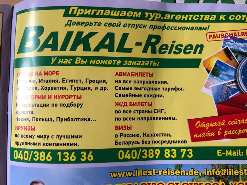 Там вам бесплатные материалы на стендах расскажут о том, как велик русский народ, помогут забеременеть (по записи, я полагаю), снимут порчу, плюс немного насадят скреп трезвости среди жен и помогут с путевками фирмы «Байкальские туры» (Baikal-reisen).