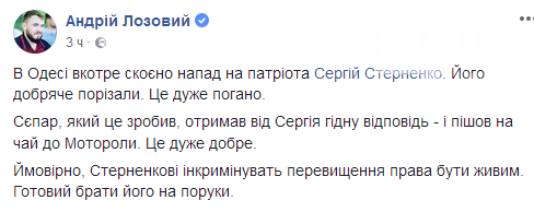 В данный момент активист находится в больнице. Редакция 048 связалась с адвокатом Стерненко и готовит к публикации интервью.