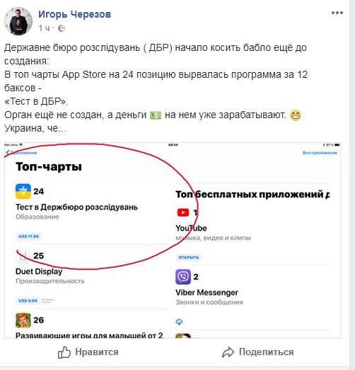 "ГБР начало косить бабло ещё до создания: В топ чарты App Store на 24 позицию вырвалась программа за 12 баксов - "Тест в ДБР". Орган ещё не создан, а деньги на нем уже зарабатывают", - пишет адвокат Игорь Черезов Facebook.