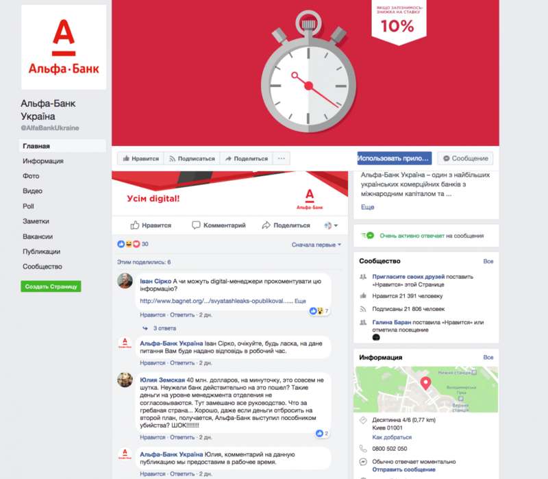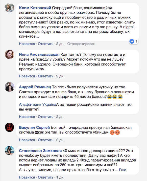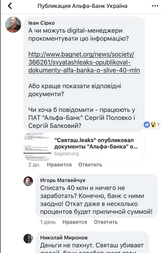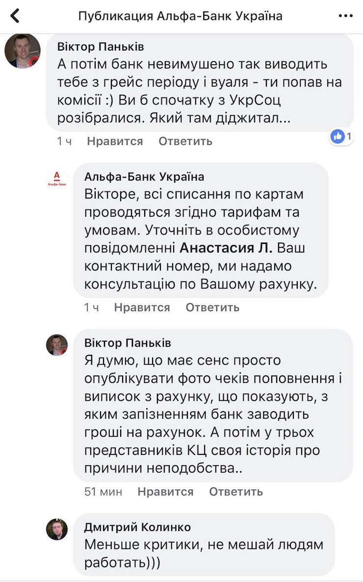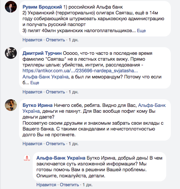 Странное поведение «Альфа-банка» заметили и его клиенты. В комментариях под постами банка в Facebook они потребовали объяснений, но внятной позиции так и не дождались. Сначала в «Альфа-банке» ссылались на нерабочее время, хотя и продолжали дискуссию по другим вопросам. Позже и вовсе, как говорится, включили окуня и сделали вид, что не понимают сути вопроса.