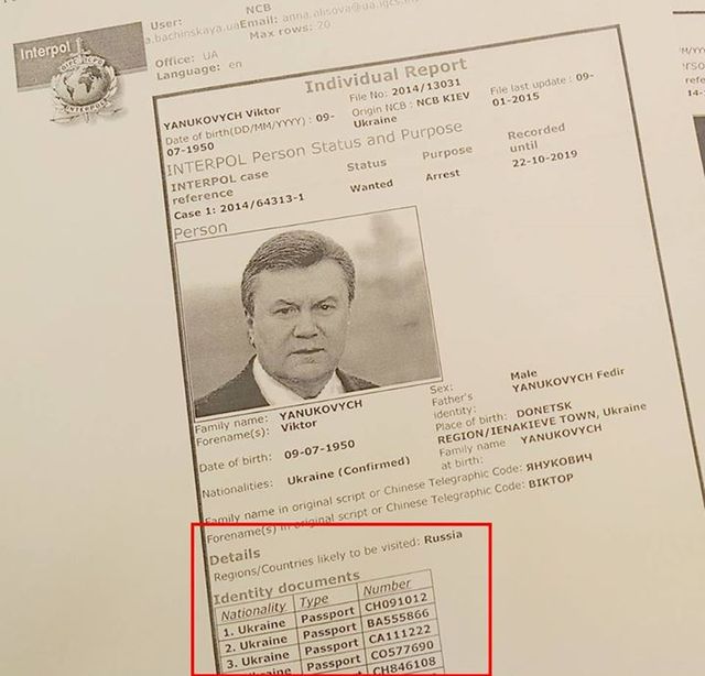 На сегодняшний день Россией игнорируются документы о розыске 24 человек, ранее занимавших высокие посты в Украине: Янукович В.Ф., Азаров Н.Я., Клюев А.П., Пшонка В.П., Якименко А.Г., Захарченко В.Ю., Раташнюка В.И., Зинова П.И., Шуляка С.М., Коряка В.В., Федчука П.М., Януковича О.В., Ставицкого Е.А., Курченко С.В., Арбузова С.Г., Клименко А.В., Присяжнюка М.В., Кузьмина Р.Р., Царева О.А., Колобова Ю.В., Игнатова А.П., Богатырева Р.В., Дзекон Г.Б., Динник О.В.